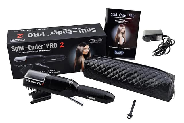 You’ll receive the Pro 2 Cordless Split End Trimmer, charger, cleaning brush, and guide accessories for accurate sectioning.